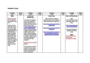 Wednesday’s timetable and activties for Miss Daley